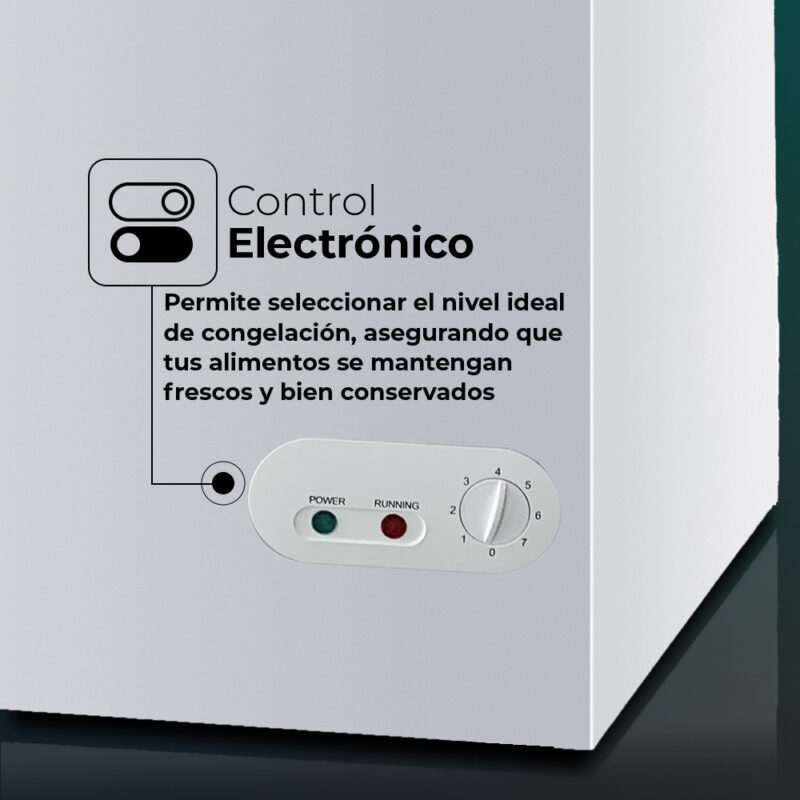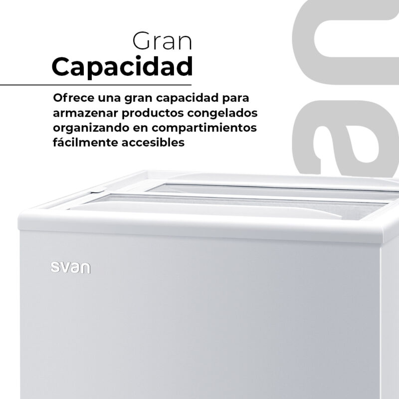 Estética blanca con 2 puertas deslizantes de cristal de abertura tipo uñero. Sistema de control manual, descongelación manual y funciones con las que sacar el mayor rendimiento al congelador.