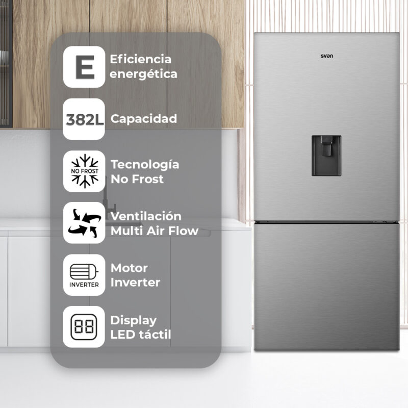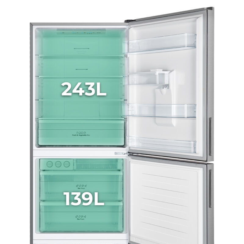 Capacidad total de 382 Litros, con congelador 4 estrellas, dispensador de agua independiente de toma de agua y múltiples compartimentos para un óptimo almacenaje.