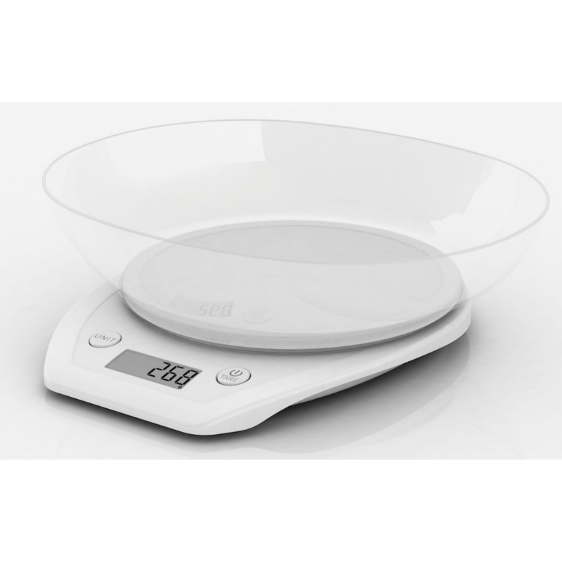 Alta precisión Bowl transparente Mide sólidos y líquidos Indicador de nivel bajo de la batería Función TARA Medidas: 26 X 16 X 2,8 cm. Pantalla LCD 4 X 1,8 cm. Funciona con 2 pilas de 1,5 V. AAA