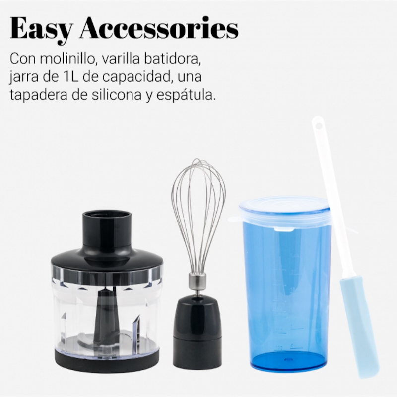 Accessories: Incluye jarra de 1000 ml con tapa y espátula de silicona. ¡Selecciona la opción con todos sus accesorios: picador y y accesorio batidor de acero inoxidable.