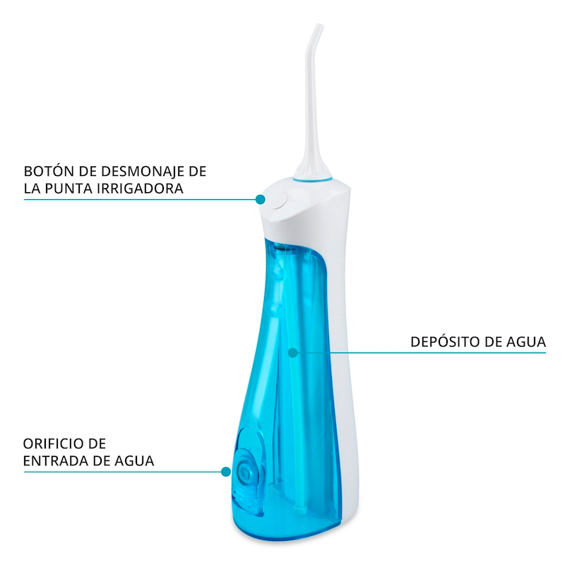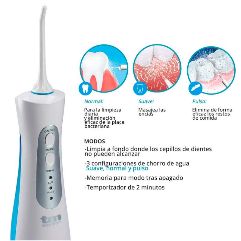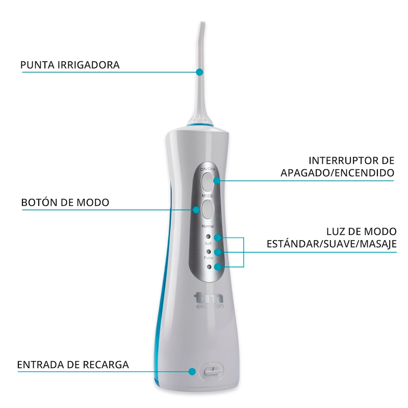 rrigador bucal portátil con batería de litio recargable por USB de TM Electron con 3 modos de uso y 2 boquillas de recambio. Consigue hasta un 93% más de eficacia en tu higiene bucal completando tu cepillado diario con la irrigación. Especialmente indicado para los usuarios de ortodoncias, implantes, brakets, etc.