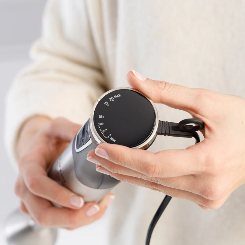 Batidora de mano de 1700W de potencia, para picar absolutamente todos los alimentos, incluso los más duros como el hielo. Los 1700W y las cuchillas de 4 filos de acero inoxidable te permitirán obtener mezclas y batidos totalmente picados, finos y homogéneos de una sola pasada. Incorpora un regulador de velocidad progresiva para que puedas adaptar la velocidad a la receta que estés realizando. Incluye también un vaso medidor de 1L en el que podrás picar lo que quieras.