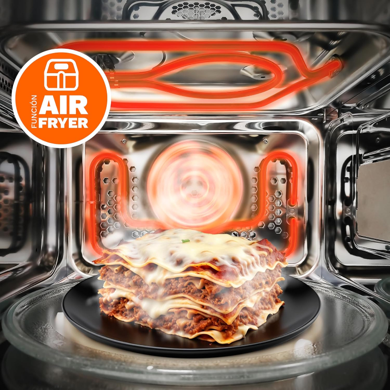El microondas Grunkel MW-28AIRFRYER es un electrodoméstico 3 en 1 que combina microondas, grill y freidora de aire, ofreciendo versatilidad y eficiencia en la cocina. Con una capacidad de 28L y una potencia de 900W, permite calentar y cocinar de manera rápida. Su grill de 1200W y la función de Air Fryer de 2200W proporcionan un dorado uniforme y un acabado crujiente en carnes, verduras y horneados. Incluye un accesorio especial de Air Fryer, que junto con sus 3 modos de freidora de aire, permite cocinar alimentos con menos grasa y más sabor. Además, cuenta con 5 niveles de potencia, 8 programas preestablecidos y una función de descongelado por peso. Su interior de acero inoxidable, control digital y bandeja de cristal de Ø315mm garantizan durabilidad y facilidad de limpieza. Con bloqueo parental y apertura con tirador, es seguro y práctico para cualquier cocina.