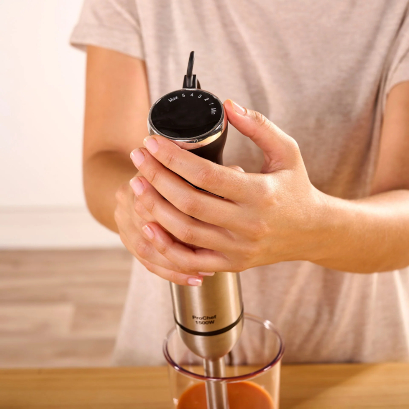 1500W, regulador de velocidades progresivo, funcion turbo, 4 cuhillas de alta resistencia de acero inoxidable, pica hielo, anti salpicaduras, diseño ergonomico, varilla acero inoxidable, desmontable, facil montaje, incluye emulsionador, jarra picadora 600ml y vaso medidor de 700ml