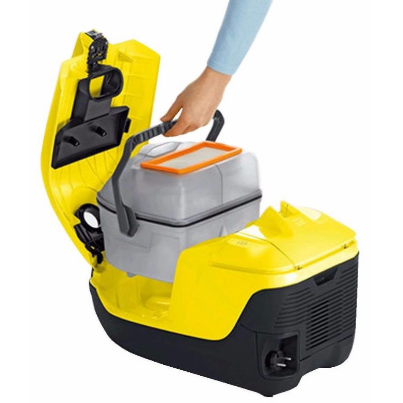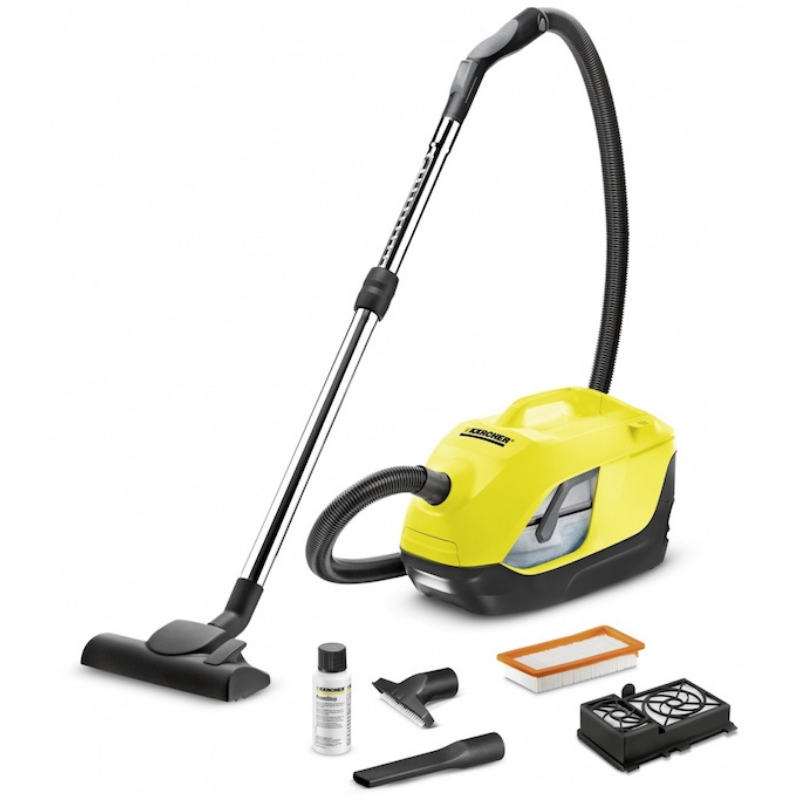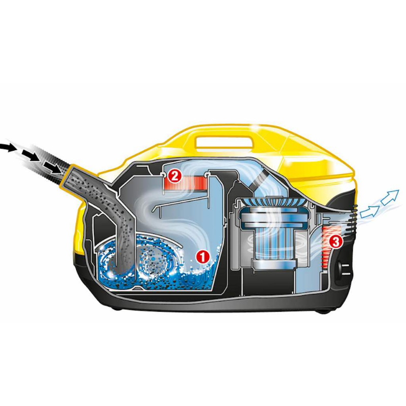 El aspirador DS 5.800 con ltro de agua no solo limpia suelos a fondo, sino que tambie´n proporciona un aire de salida ma´s fresco y un 99,9 % sin polvo. Esto origina un ambiente perceptiblemente ma´s agradable en la habitacio´n. Al contrario de un aspirador convencio- nal con bolsa de ltro, el recientemente desarrollado aspirador con ltro de agua DS 5.800 apuesta por la fuerza natural del agua, que se arremolina en el ltro a alta velocidad. La suciedad aspirada pasa por este remolino de agua, se separa del aire y se une al agua e cazmente. El resultado es un aire de salida extraordinariamente fresco y limpio.