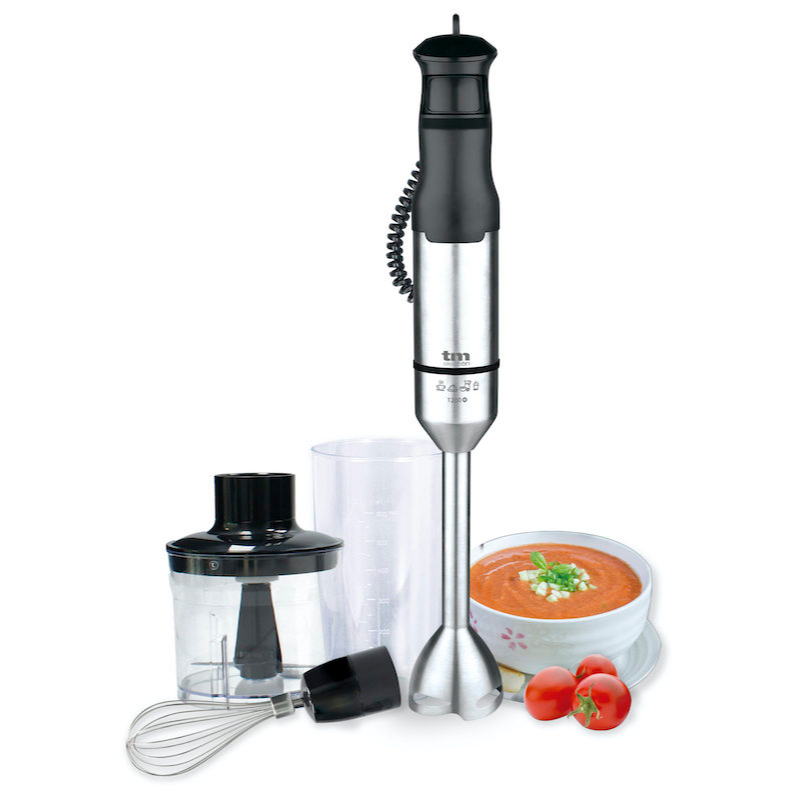 La batidora de mano TMPBA017 con 1200W de potencia, campana y eje de acero inoxidable, vaso graduado de 900ml, picador de 500ml con tapa con engranaje y hoja picadora afilada de acero inoxidable, varillas metálicas diseñadas para mezclar alimentos, empuñadura ergonómica y antideslizante de TM Electron es un elemento indispensable en cualquier cocina de hoy en día ya que te permite mezclar o batir pequeñas cantidades, además ocupan un espacio mínimo.