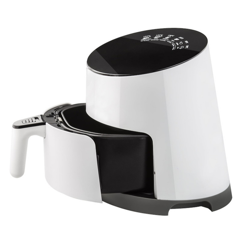 Freidora sin aceite blanca con patas de goma antideslizantes.