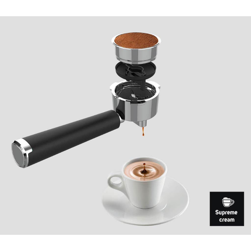 Cafetera con Supreme Cream incorporado en el cacillo de la cafetera que erosiona el café de tal forma que consigue un café con abundante crema de cafetería.