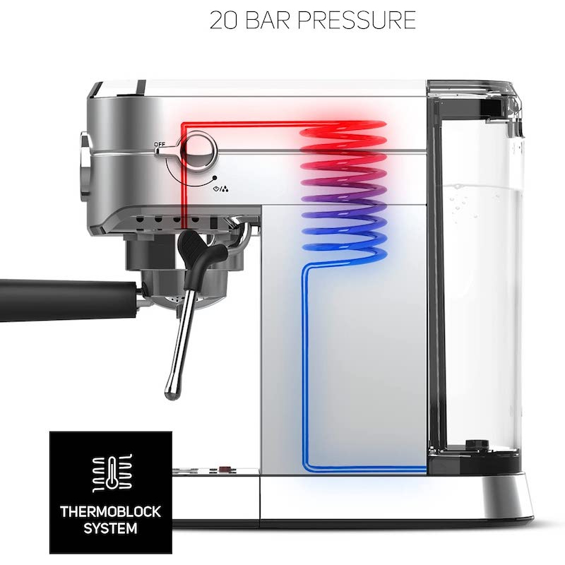 El calentamiento del agua por Thermoblock garantiza poder disfrutar al instante, con solo pulsar un botón, de un café con toda su crema y sabor.
