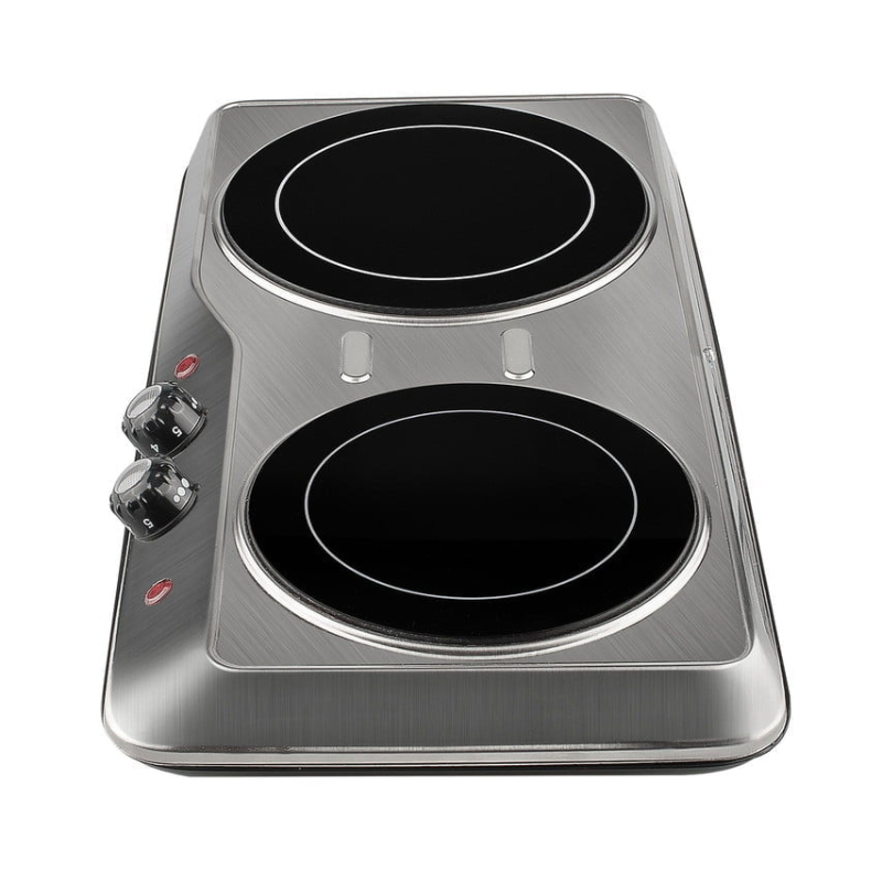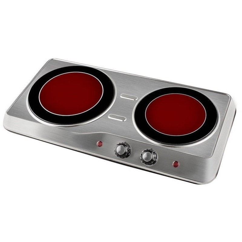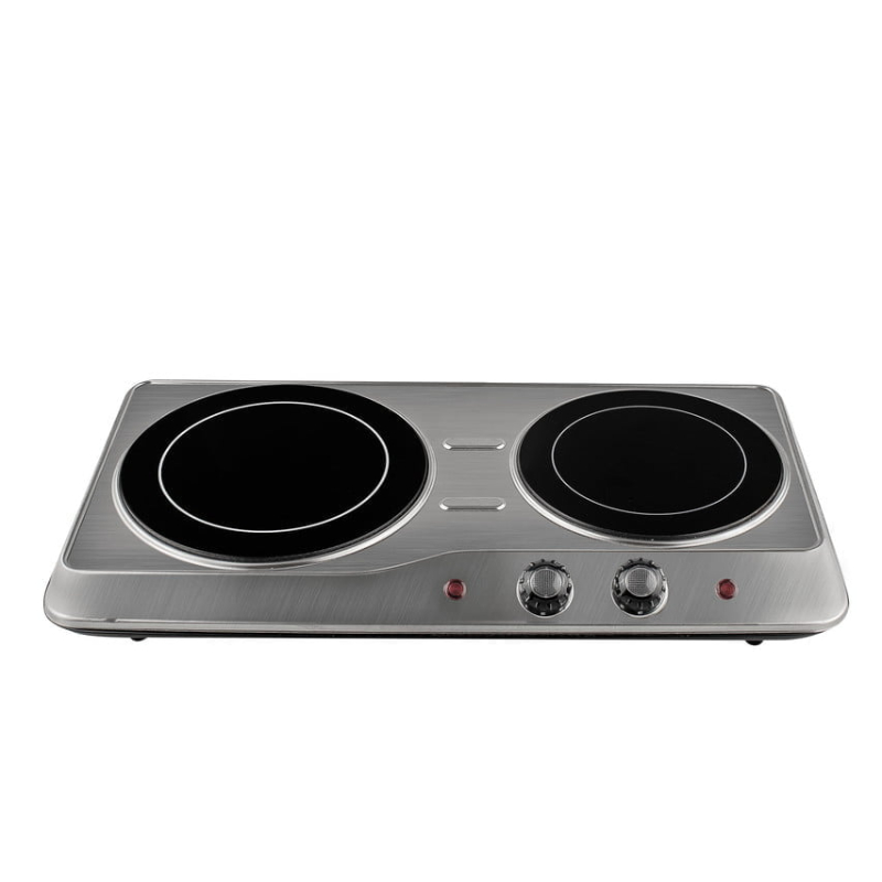 Doble hornillo vitro compacto y eficiente. Con control de temperatura por fuego, diseño resistente y acabado en acero y cristal fácil de limpiar.