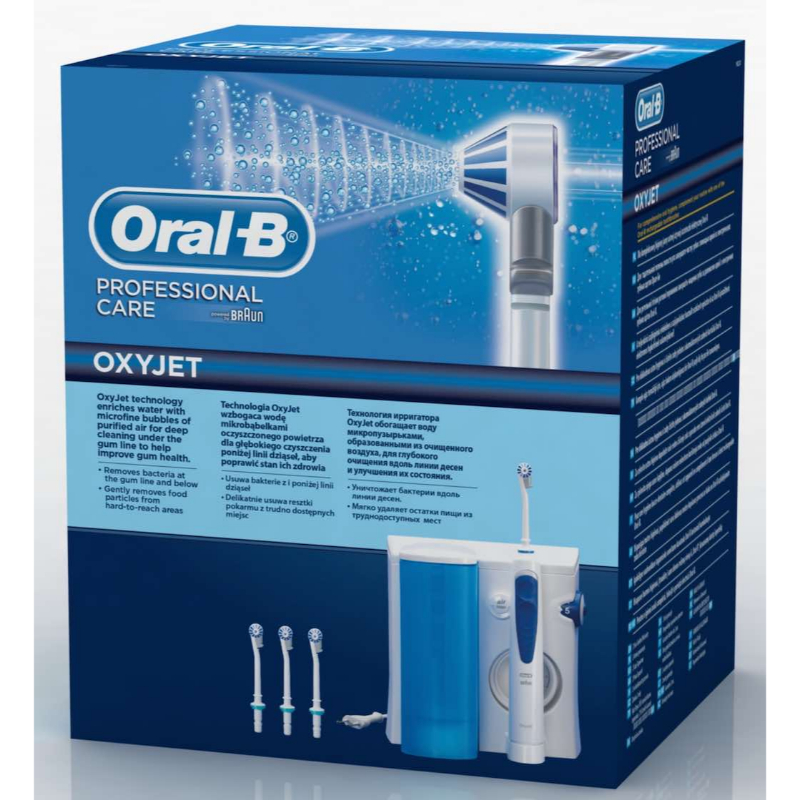 Oral-B Professional Care OxyJet emplea tecnología de microburbújas para combatir las bacterias de la placa. Combina aire y agua en microbúrbujas para reducir de forma significativa el sangrado y las bacterias asociadas a la enfermedad gingival, cuando su uso se combina con el cepillado.