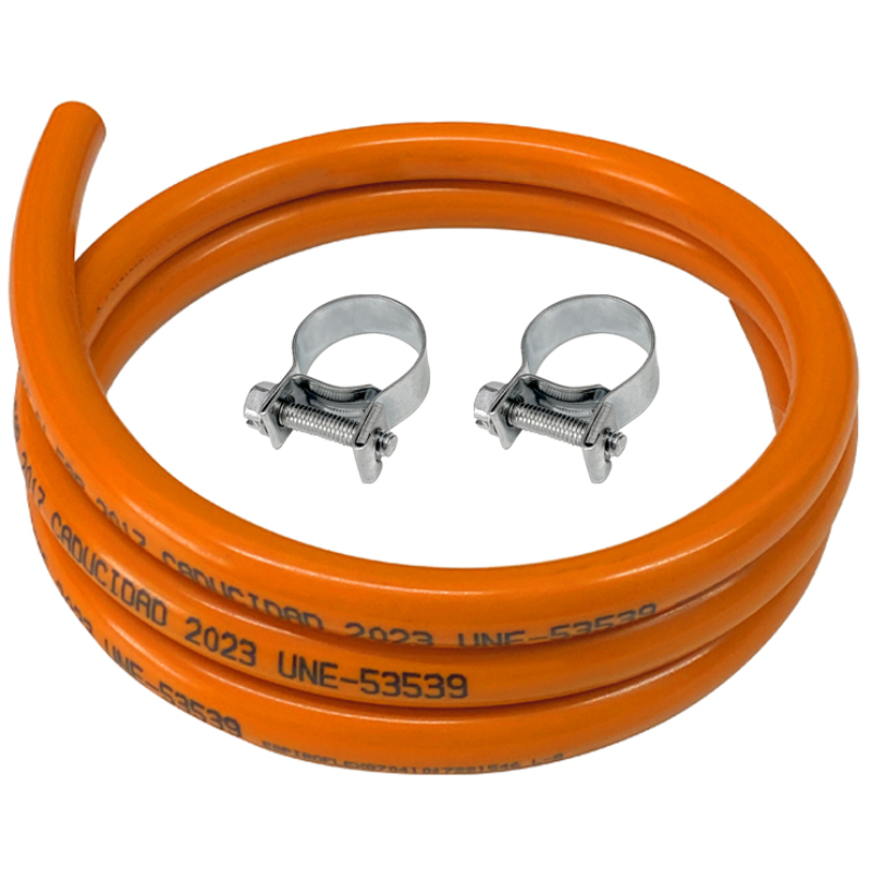 KIT Manguera de butano 1,5 mts. + 2 Abrazaderas Regulador de Gas 28/30 mba. CE EN 12864 / EN 16436 Manguera de butano con Certificado AENOR UNE 53539