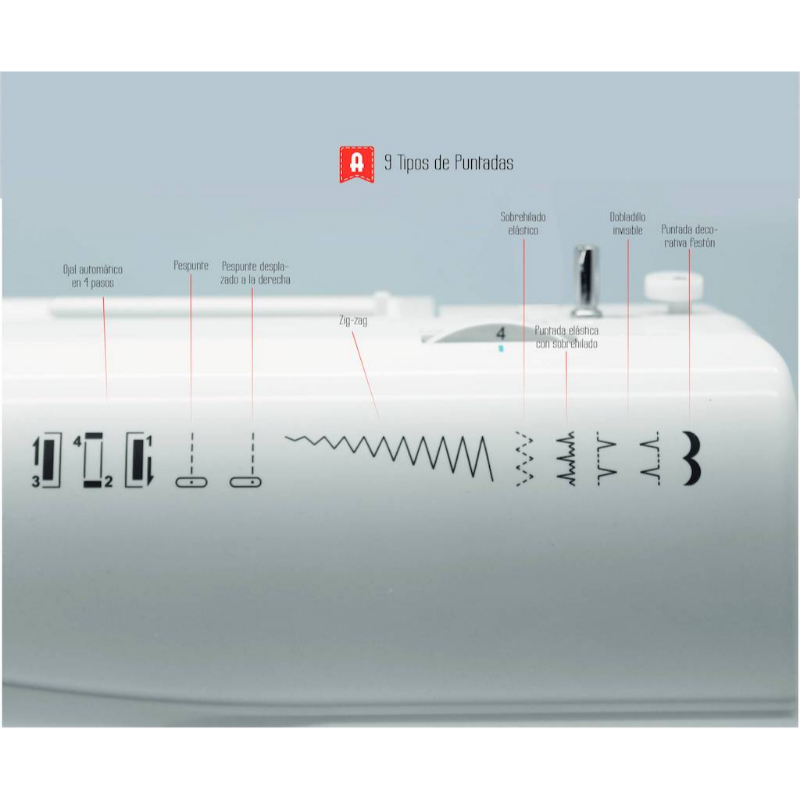 9 puntadas para todo tipo de labores: Ojal automático en 4 pasos, Básicas, Decorativas, Festones, Zig-Zag