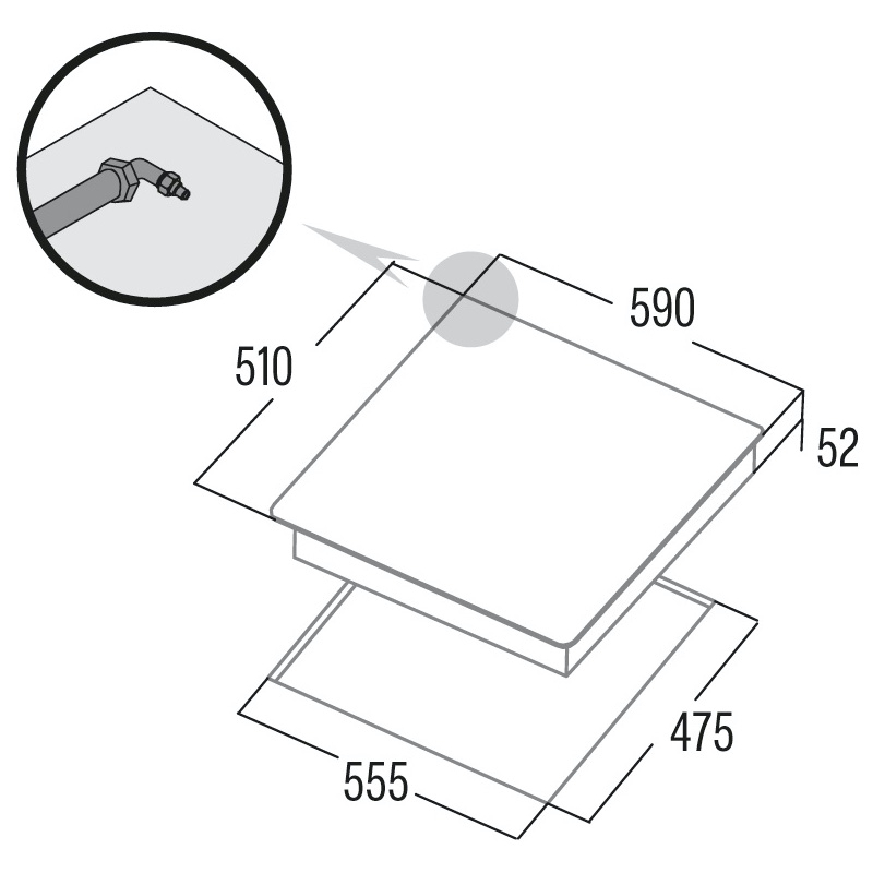 Encimera Multigas preparada para Gas Natural (G20) con accesorios para fácil acoplamiento a Gas Butano (G30). El sistema de anclaje son pletinas de fijación. Cuenta con encendido eléctrico integrado en mando. Posee 3 quemadores de gas, el izquierdo es una triple corons de 3kW, el superior derecho es semi-rápido de 1,75 kW y, por último, el inferior derecho es auxiliar de 1kW.
