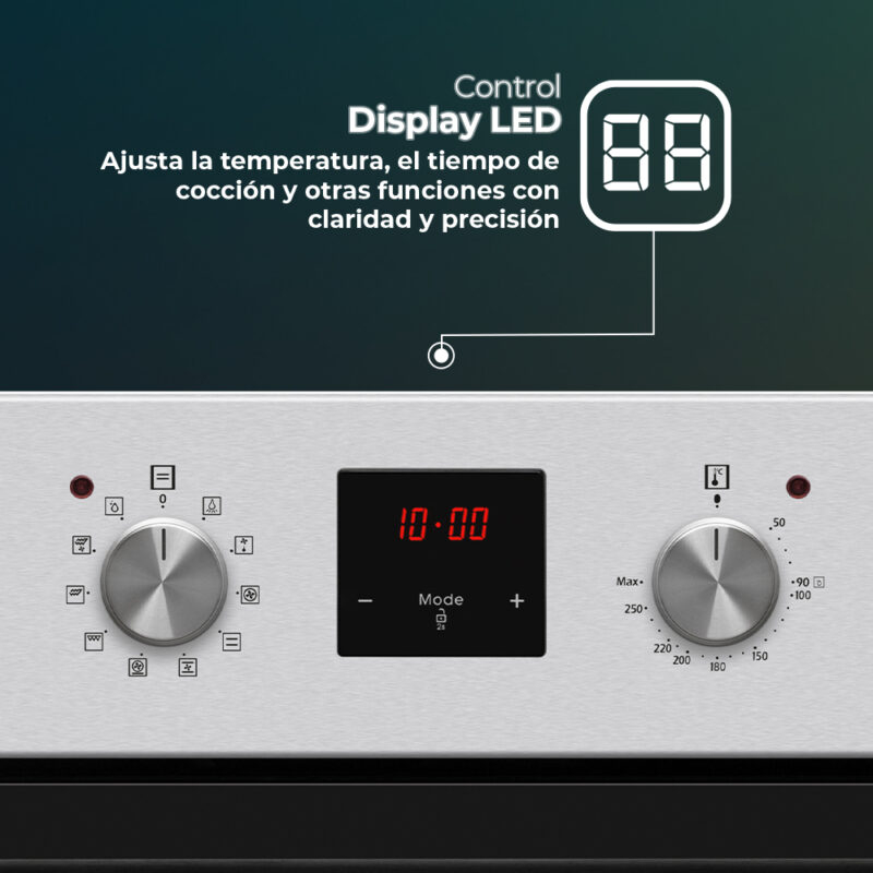 Estética Inox con puerta de doble cristal. Dispone de guías telescópicas, soporte metálico para las bandejas e iluminación interior. Panel de control táctil con Display LED y mandos estándar, con termostato y temporizador digital. Ofrece 10 programas de cocción y diversas funciones para obtener el mayor rendimiento y facilitar el proceso de cocción.