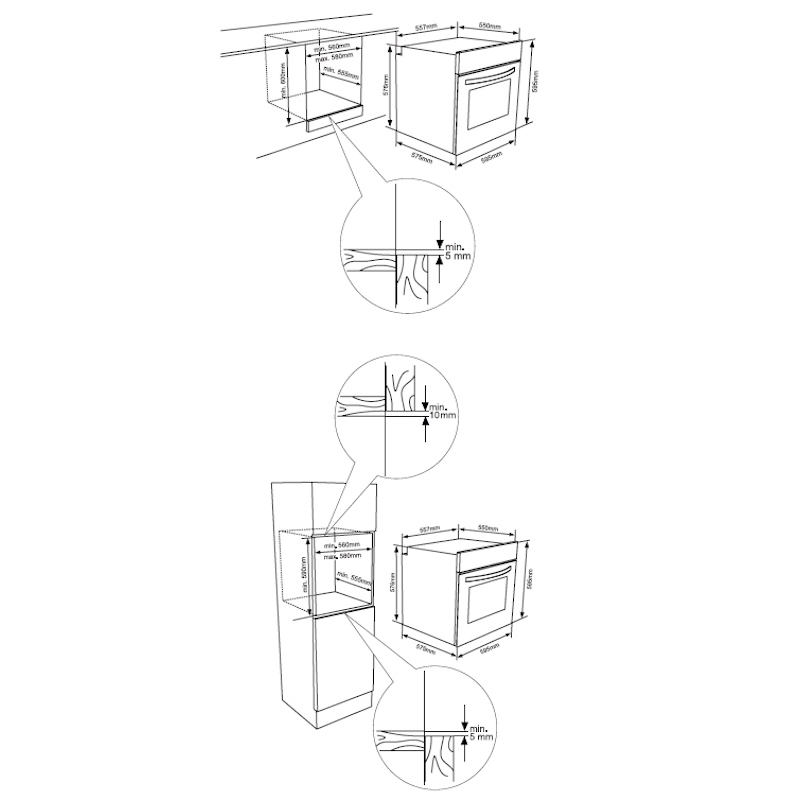 Encastre sin introducir el panel: min 600 x min 560 / max 580 x min 555 mm