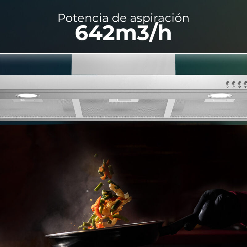 Campana de doble tiro con motor universal y potencia de aspiración de 641,8 m3/h. Eficiencia energética A y nivel sonoro de 68 dB.