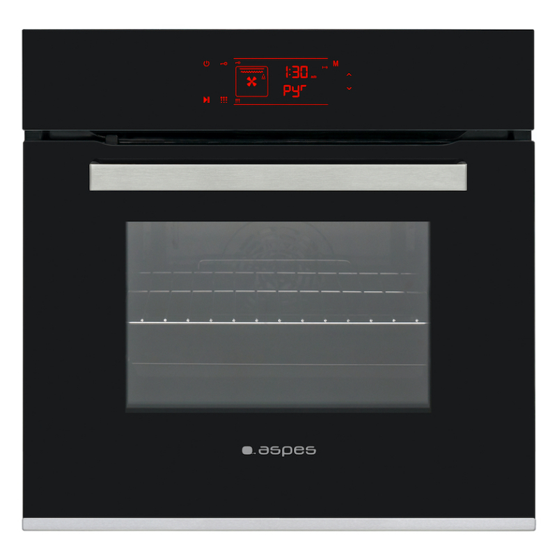 Horno Pirolítico de 60 cm Aspes con eficiencia energética A, capacidad 70 L, 8 funciones, Limpieza Pirolítica, Turbo Ventilador, sistema de control Display LED Táctil, estética Negra con perfil Inox y luz interior.