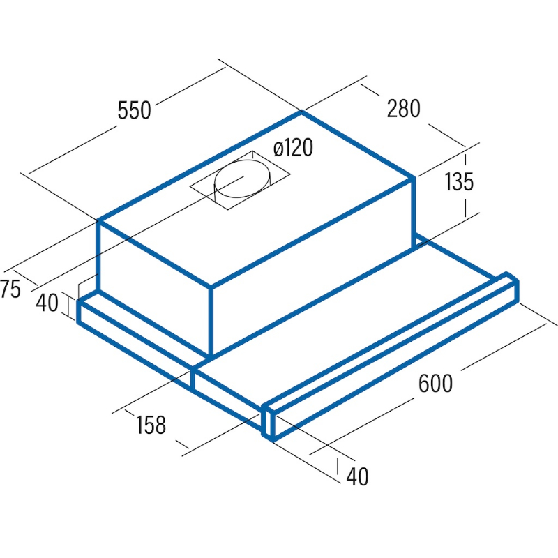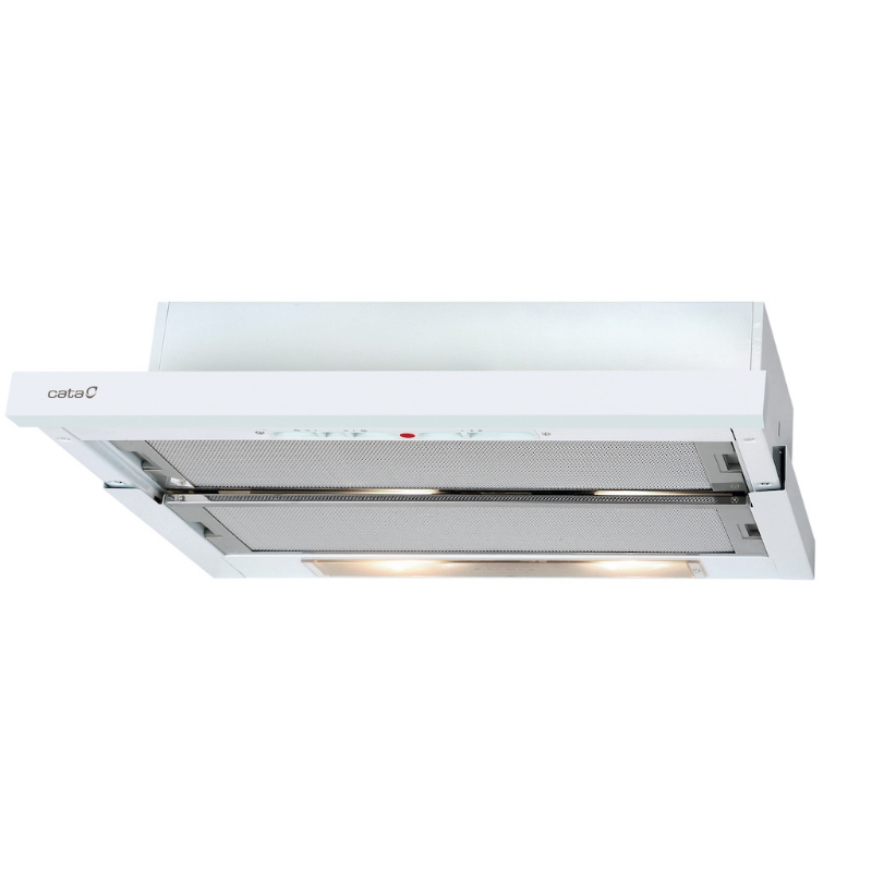 Campana telescópica de instalación en mueble con acabados en Blanco. Ofrece 3 niveles de extracción con un panel de mando tipo slider además de un sistema de apertura que ofrece mayor área de extracción. Incorpora 2 motores de 125W cada uno.