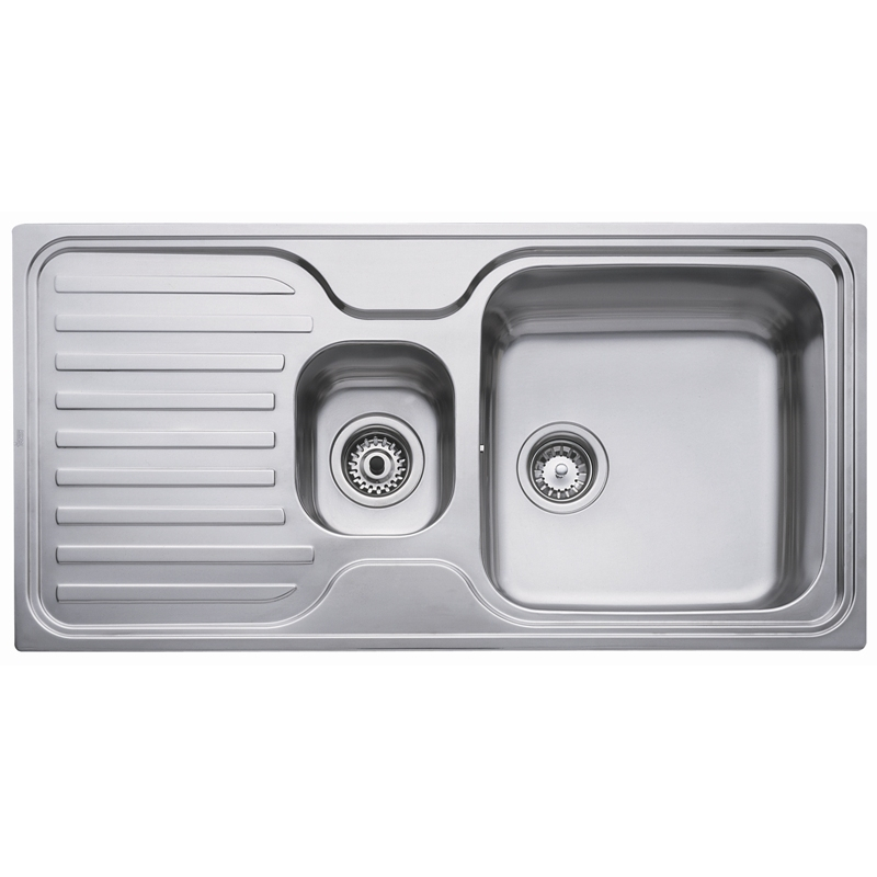 Fregadero de cubeta grande, cubeta auxiliar y escurridor Acero inoxidable 18/10 Válvula canasta 3 1/2" Chapa de gran espesor Acabado alto brillo Profundidad de las cubetas 190 y 135 mm Mueble de 70 cm