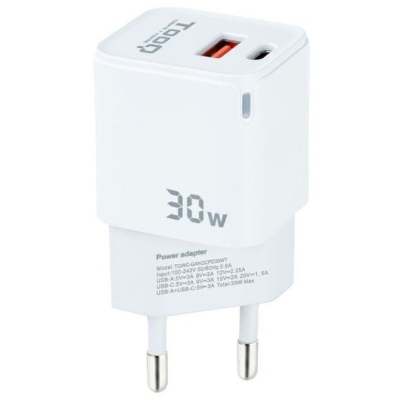 Cargador de Pared GaN USB-C/PD + USB-A/QC 30W, Blanco