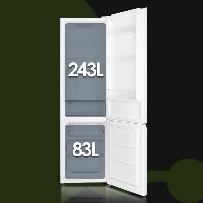 Capacidad total de 326 Litros, con congelador 4 estrellas y múltiples compartimentos para un óptimo almacenaje.